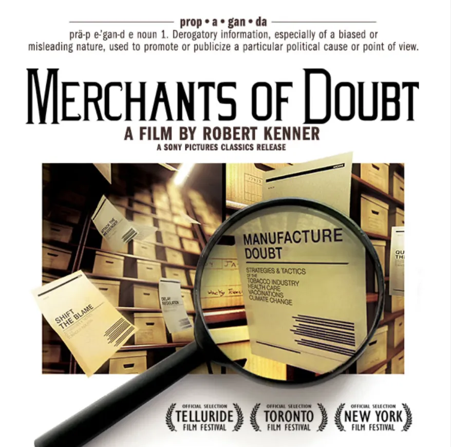 Merchants of Doubt is a documentary exposing how professional pundits and contrarian scientists, acting as "experts," use disinformation tactics to cast doubt on scientific consensus. Inspired by the book of the same name by Naomi Oreskes and Erik M. Conway, it traces how methods used to obscure the dangers of tobacco were adapted by special interests to delay action on climate change.